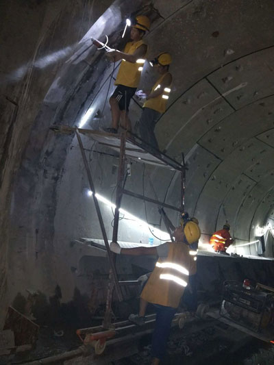 (2)管片拼缝渗漏:采用压力注浆法,灌注超细水泥浆及环氧树脂,并用环氧树脂胶泥对混凝土进行外封闭处理。